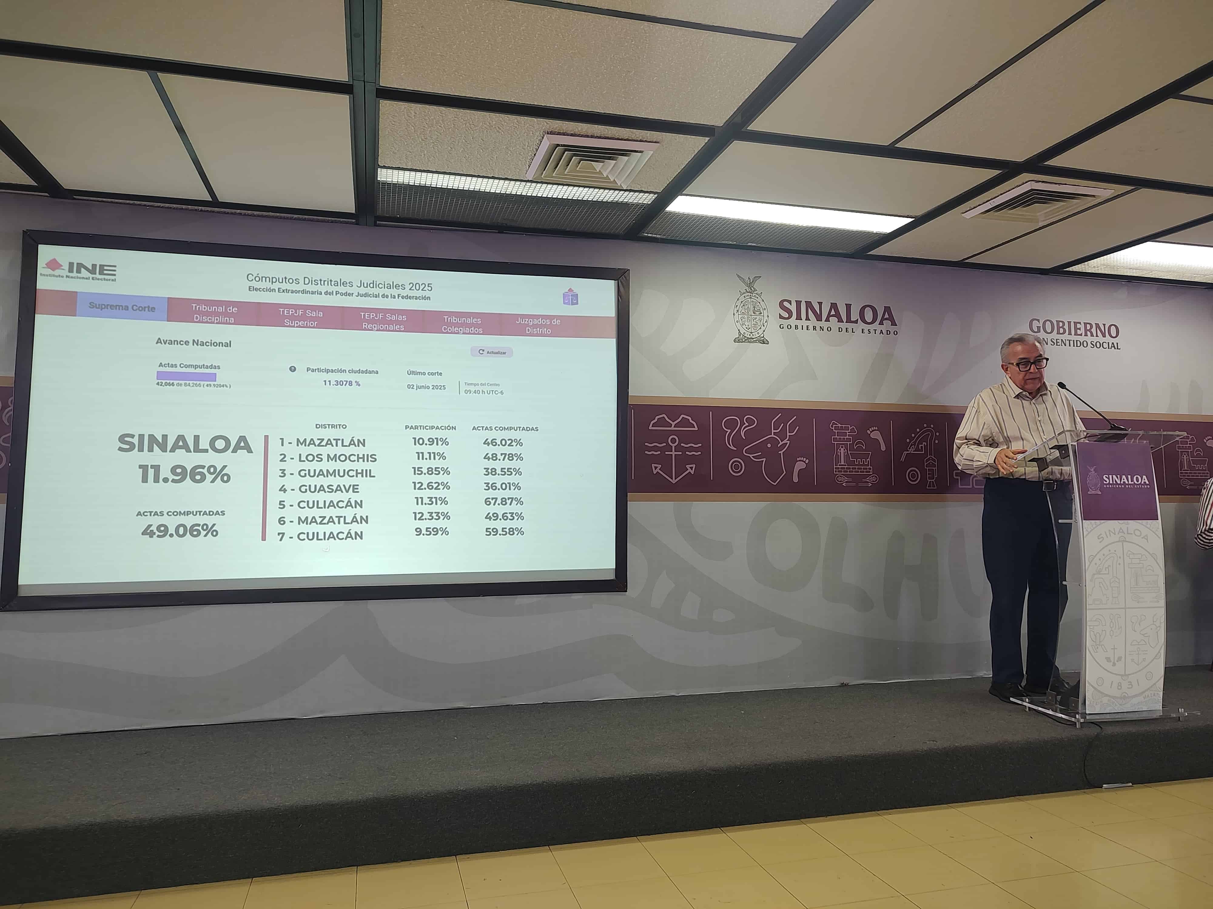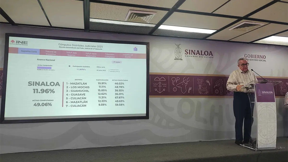 Sinaloa registra 11.96% de participación en la Elección Judicial tras computarse el 49% de actas, informó el gobernador Rubén Rocha Moya.