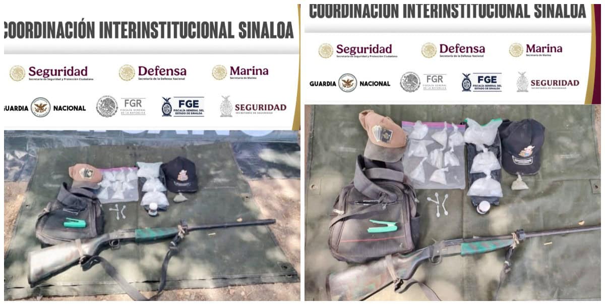 Elementos del grupo interinstitucional aseguraron una arma larga y dosis de distintas drogas en la sindicatura de Costa Rica, Culiacán.