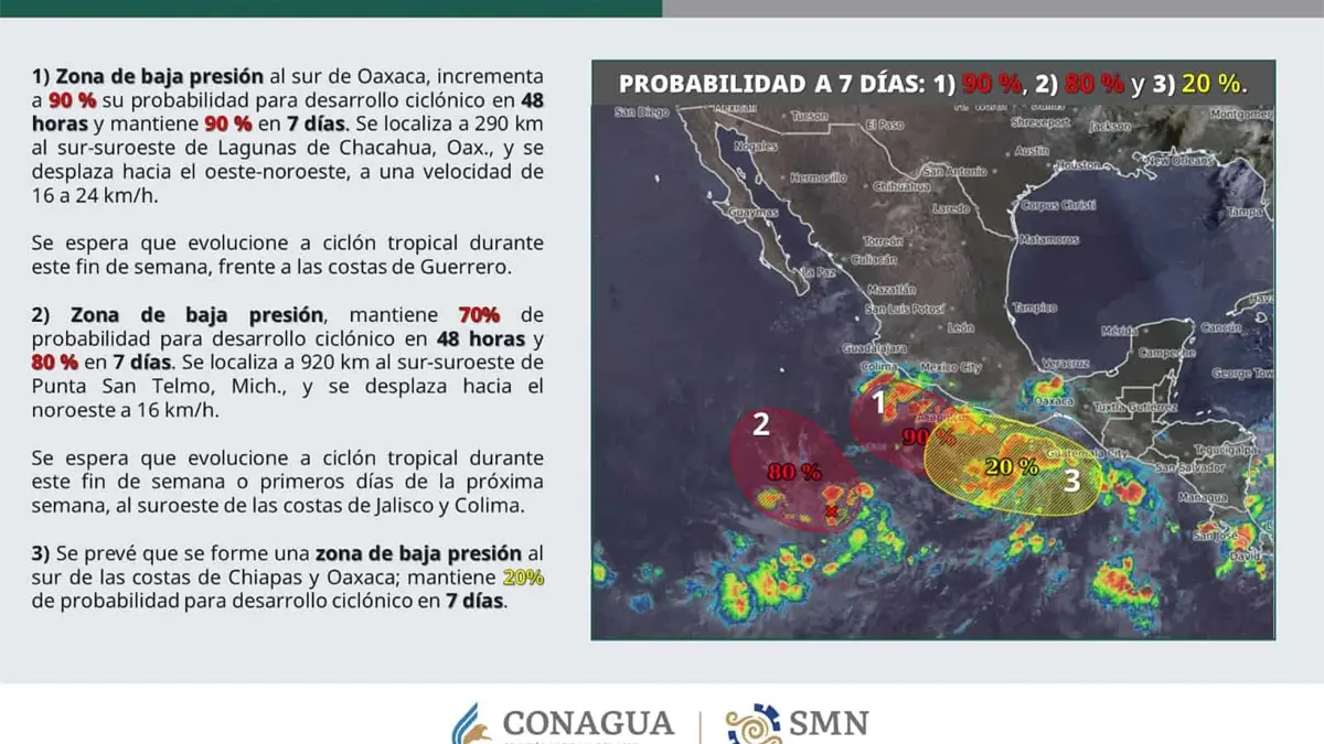 La Conagua vigila tres zonas de baja presión que pueden desarrollar Ciclones Tropicales en el Océano Pacífico este fin de semana.