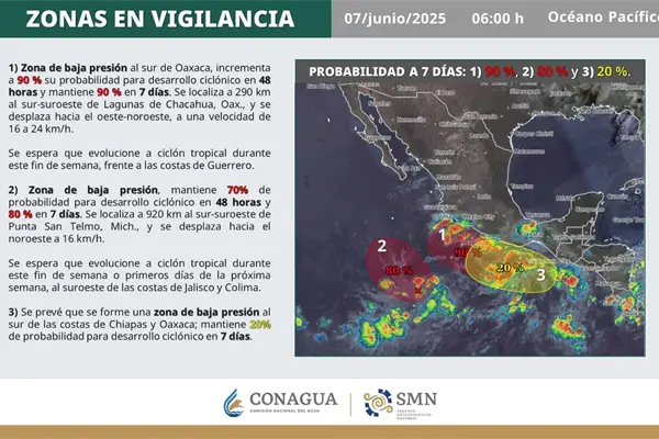 El Servicio Meteorológico Nacional (SMN) mantiene bajo estrecha vigilancia tres zonas de baja presión en el Océano Pacífico, dos de las cuales presentan alta probabilidad de desarrollo ciclónico en las próximas horas, lo que podría dar origen al ciclón Bárbara.