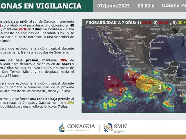 Además, se prevé la formación de una tercera zona de baja presión al sur de Chiapas y Oaxaca, que por el momento mantiene 20% de probabilidad de convertirse en ciclón tropical en los próximos 7 días, aunque se mantendrá bajo monitoreo constante.