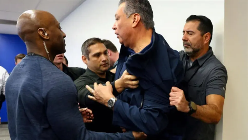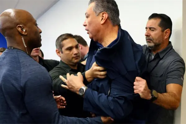El funcionario de origen mexicano irrumpió en la sala de prensa para abordar a la secretaria y hacerle una serie de preguntas sobre los disturbios en Los Ángeles, pero este fue sacado del lugar.