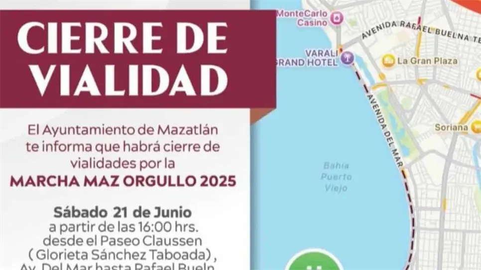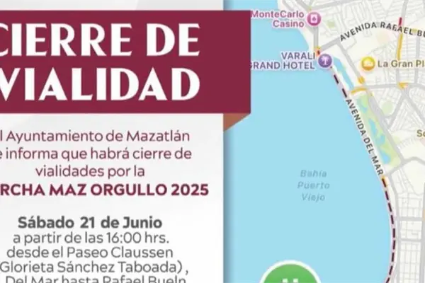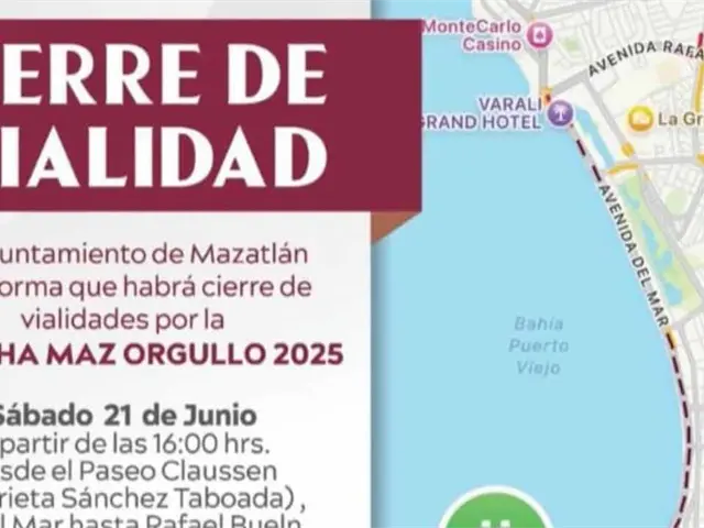 Si tienes planeado circular por las principales avenidas del puerto este sábado 21 de junio, por la tarde, toma tus precauciones, ya que el Ayuntamiento de Mazatlán anunció el cierre de vialidades por la realización de la marcha 'Más Orgullo 2025', en el marco del Mes del Orgullo LGBT+.