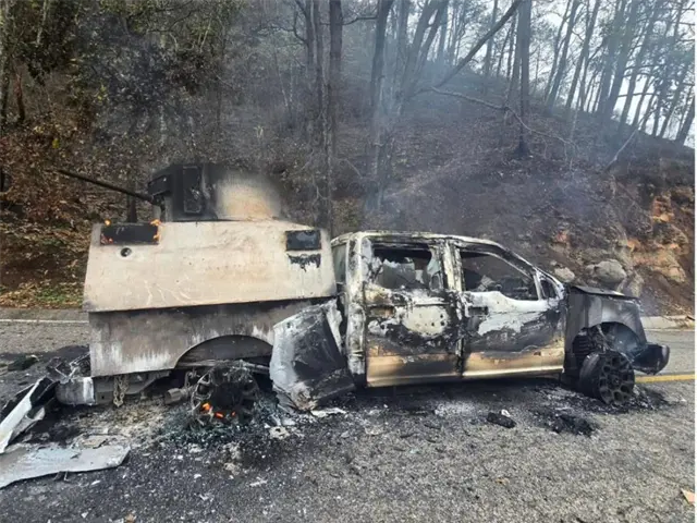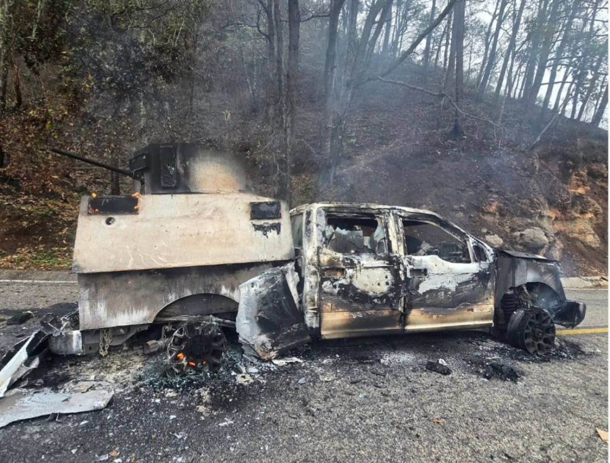 Un vehículo con blindaje artesanal incendiado fue asegurado por elementos de la Secretaría de la Defensa Nacional tras una agresión que repelieron en la sierra del municipio de Concordia.