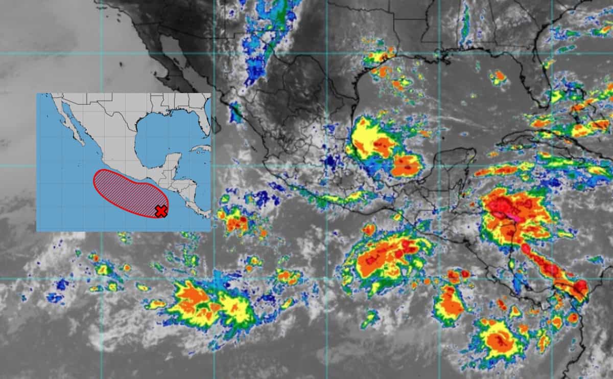 La zona de baja presión se ubica a 620 kilómetros al sur de la desembocadura del río Suchiate, en la frontera entre México y Guatemala, y se desplaza lentamente hacia el oeste-noroeste.