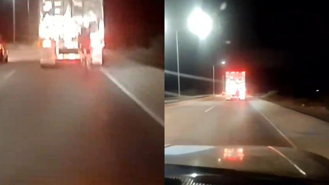 A través de un video que circula en redes sociales, se exhibió a un ciclista que fue captado viajando casi pegado de la parte trasera de un tráiler sobre la carretera estatal Los Mochis–Topolobampo, justo en la salida del puerto hacia la ciudad.