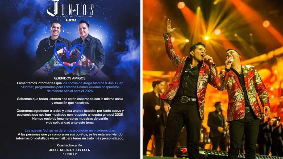"Lamentamos informarles que los shows de Jorge Medina y Josi Cuen 'Juntos', programados para Estados Unidos quedan propuestos de manera oficial para el 2026", informaron a través de un comunicado.