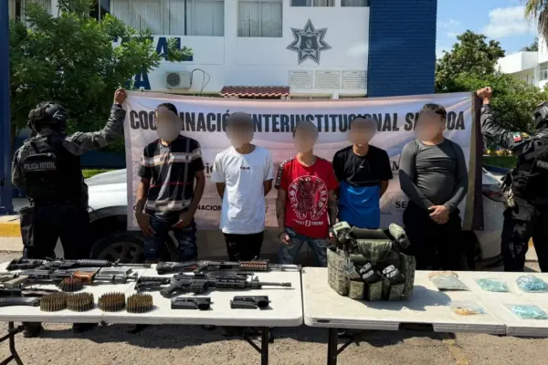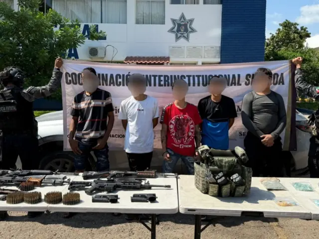 Elementos de la Secretaría de Seguridad Pública de Sinaloa, a través de la Policía Estatal Preventiva, en coordinación con la Guardia Nacional, el Ejército Mexicano, la Secretaría de Marina, la Secretaría de Seguridad y Protección Ciudadana, la Fiscalía General de la República y la Fiscalía General del Estado, detuvieron a cinco civiles a quienes les aseguraron armamento, municiones, equipo táctico y otros objetos de delito en la sindicatura de Aguaruto al poniente de Culiacán.
