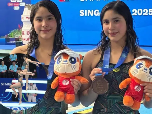 Las gemelas mexicanas Lía y Mía Cueva Lobato hicieron su debut en campeonatos mundiales de mayores, con una medalla de bronce, luego de subir al podio de honor en la competencia femenil de sincronizados trampolín 3 metros, tras sumar 294.36 puntos, en la final que se realizó este martes en el Mundial de Deportes Acuáticos Singapur 2025.