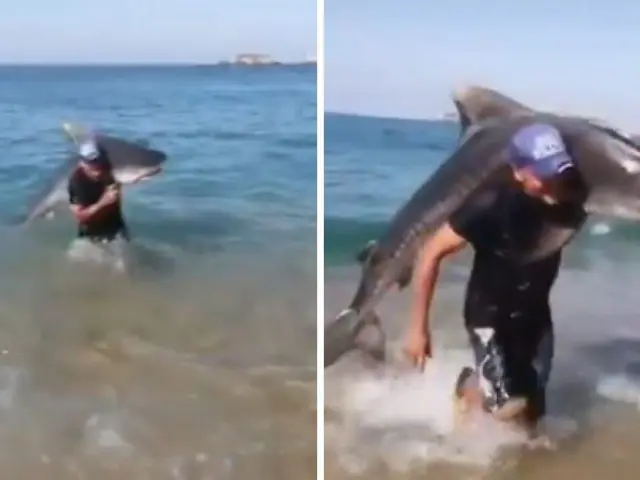 Las personas que fueron testigos del hecho, de inmediato grabaron en sus teléfonos celulares cuando la personas emergía del mar cargando en sus hombre al gran escualo.