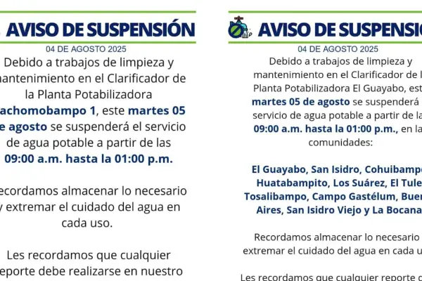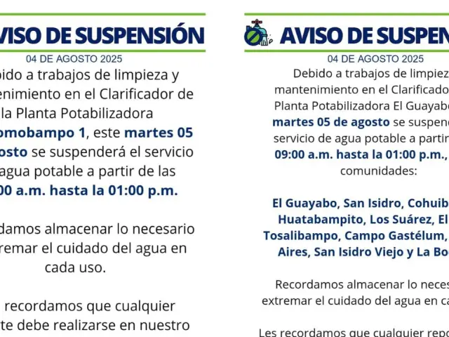 Este martes 5 de agosto, la Junta de Agua Potable y Alcantarillado del Municipio de Ahome suspenderá el servicio a 12 comunidades por trabajos de limpieza y mantenimiento en los clasificadores de la Planta Potabilizadora El Guayabo y la Planta Potabilizadora de Bachomobampo 1.