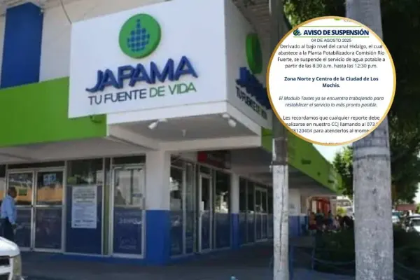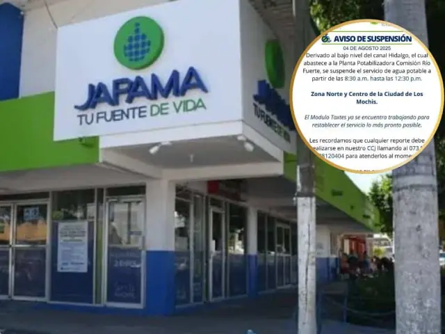 El servicio de agua potable en la zona centro y norte de la ciudad de Los Mochis, permanecerá suspendido, este lunes 4 de agosto, desde las 8:30 y hasta las 12:30 del mediodía, así lo dio a conocer la Junta de Agua Potable y Alcantarillado del Municpio de Ahome (JAPAMA).