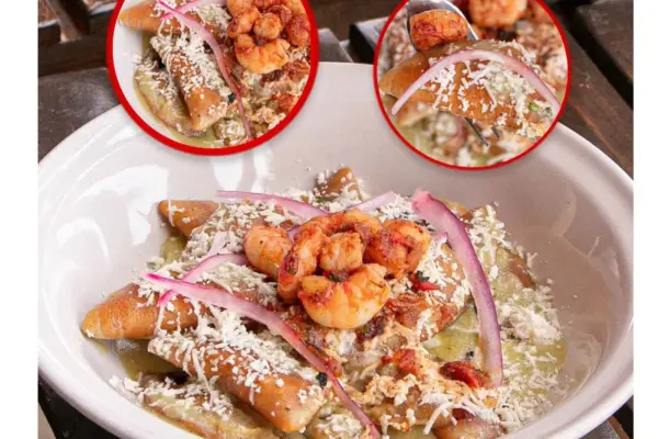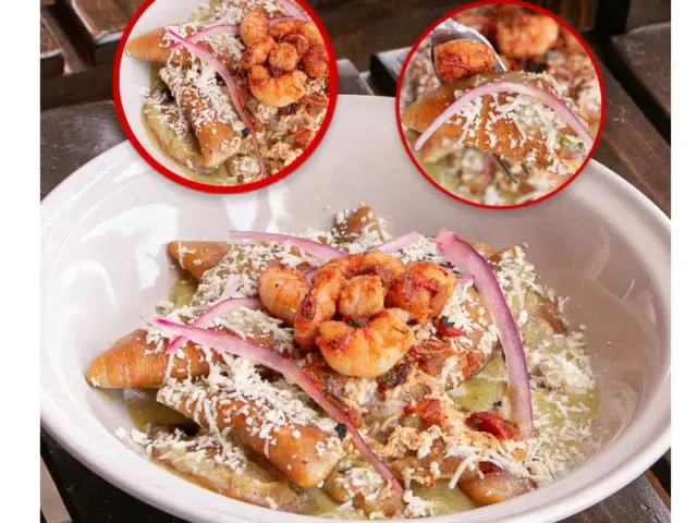 Son chilaquiles, pero en forma de empanaditas doradas y crujientes rellenas de camarón, bañadas generosamente en crema poblana, coronadas con queso, cebolla morada y un topping de camarones salteados al sartén que hacen de este platillo una auténtica explosión de sabor.
