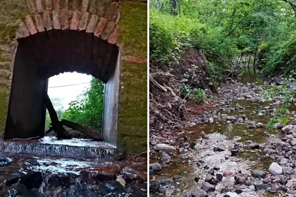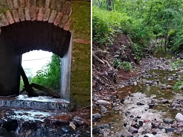 Esta pequeña presa, que ya no está en uso, muestra su fortaleza al ser una estructura de mampostería con arcos de desagüe de ladrillo rojo, un diseño que revela la función que tenía, la cual era de regular y derivar el agua del arroyo para riego y abrevadero en la zona.