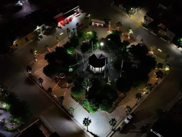 Las imágenes capturadas desde el dron muestran la ciudad desde una perspectiva única, permitiendo apreciar la disposición de los principales espacios públicos y la manera en que la iluminación nocturna resalta sus detalles.