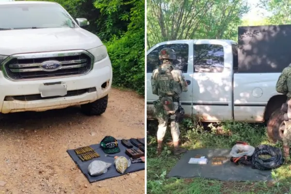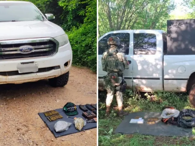 El primer hecho se registró en el poblado Molo Viejo, en el municipio de Culiacán, donde los elementos militares efectuaban trabajos de reconocimiento terrestre y localizaron una camioneta Ford, en aparente estado de abandono. Al cotejar la información de la unidad, se detectó que cuenta con reporte de robo, por lo que se realizó una inspección en la que se localizó lo siguiente: