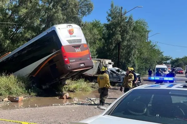 Un fuerte accidente entre un autobús de pasajeros y una camioneta se registró este mediodía en el trébol de la carretera a Costa Rica, en el municipio de Culiacán.