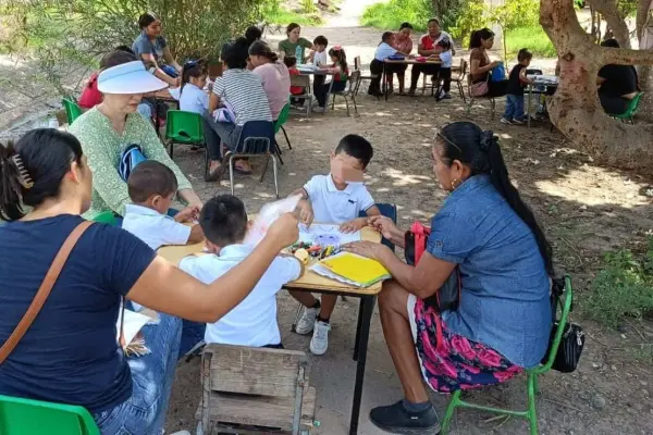 Calor y falta de luz obligan a niños de Goros Dos en Ahome a tomar clases bajo un árbol