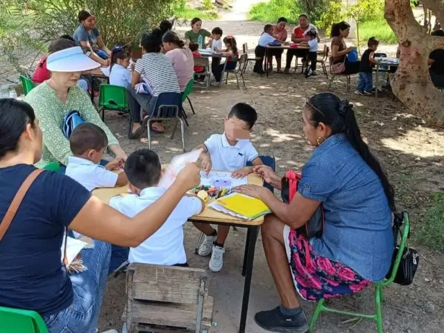 Alrededor de 17 alumnos de la escuela inicial de Goros Pueblo, en el municipio de Ahome, reciben sus clases al aire libre, debajo de un árbol del patio del plantel, debido a que el aula disponible no cuenta con suministro de energía eléctrica.