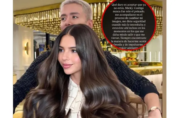 - “Que duro es aceptar que ya no estás, Micky, contigo nunca fue solo el peinado. me acompañaste en el proceso de cambiar mi imagen, me diste seguridad cuando más lo necesitaba y estuviste ahí incluso en los momentos en los que me daba miedo salir o que me vieran. Vuela alto Micky", destacó la artista, hija de Pepe Aguilar.