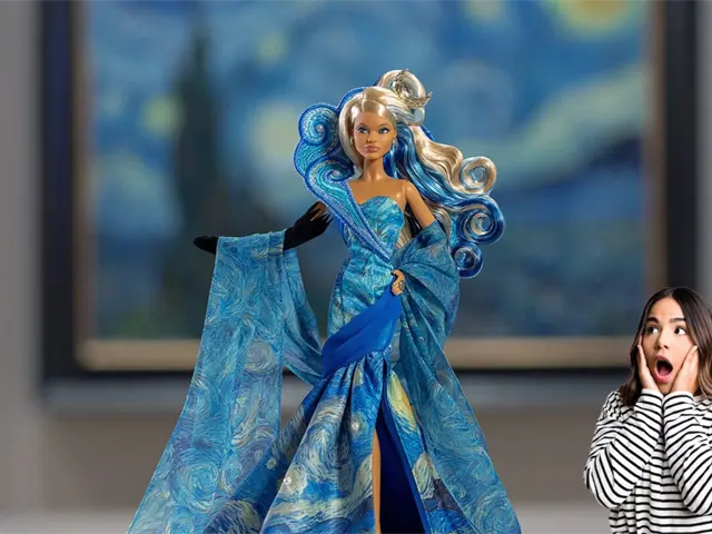 La muñeca, con su espectacular vestido de gala, es un lienzo viviente que reproduce los icónicos remolinos de la obra maestra de Van Gogh, "La Noche Estrellada". El diseño no solo captura los vibrantes tonos azules y amarillos del cuadro, sino que también incorpora un peinado que evoca la textura de la pintura, convirtiéndola en un regalo sofisticado y culturalmente relevante para esta Navidad 2025.