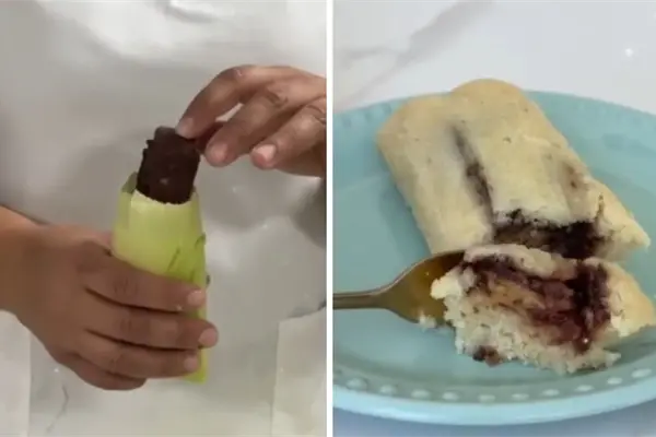 En el video se puede ver la hoja de tamal donde se le ingresa su masa y luego un pastelito Gansito en su interior.
