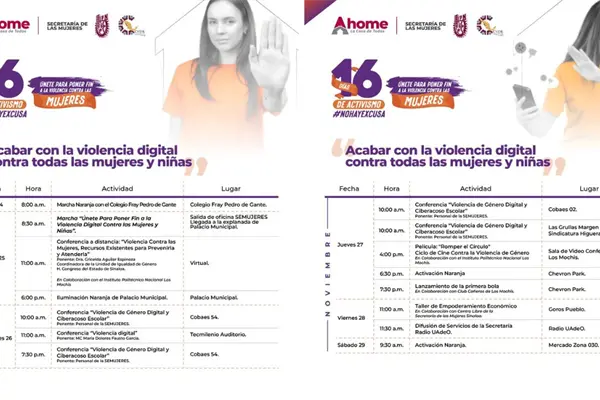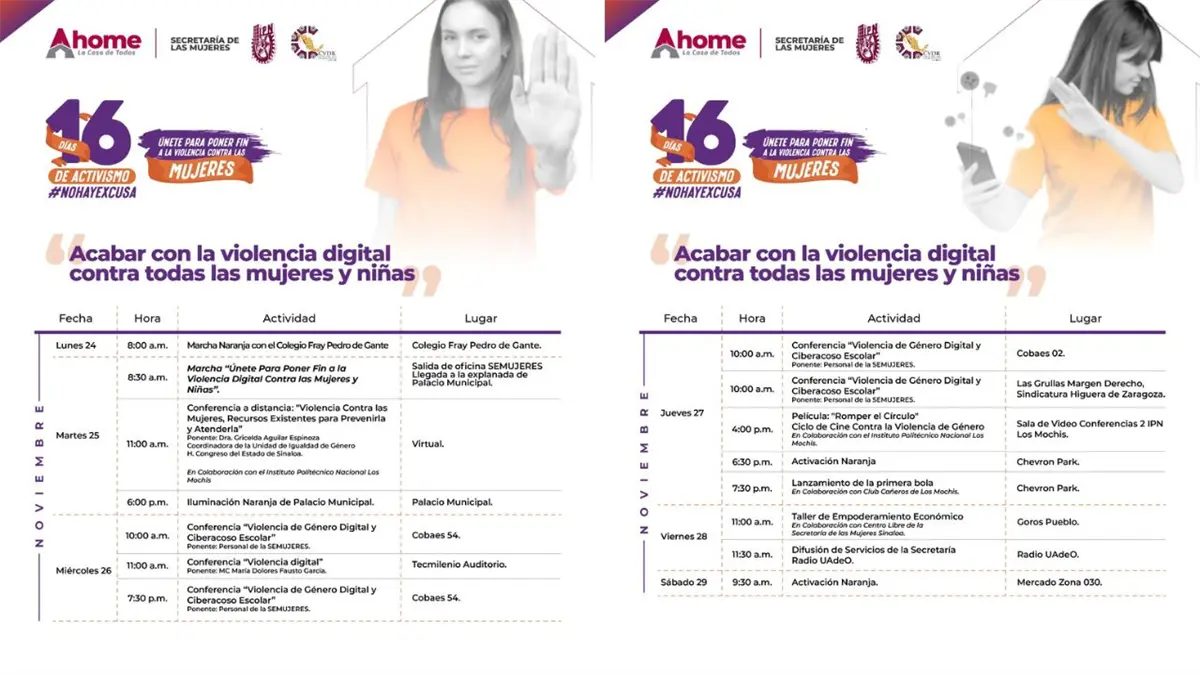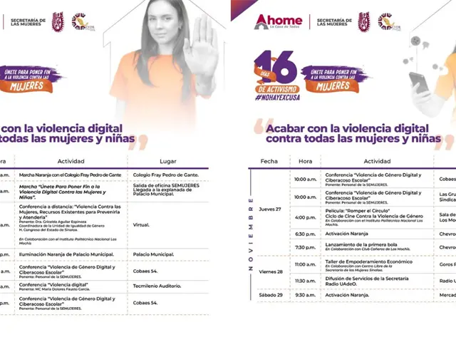 El Ayuntamiento de Ahome, a través de la Secretaría de las Mujeres (SEMUJERES), anunció el arranque del programa '16 Días de Activismo contra la Violencia hacia Mujeres y Niñas', una campaña internacional que este año incluirá marchas, conferencias, talleres, proyecciones y activaciones en todo el municipio.