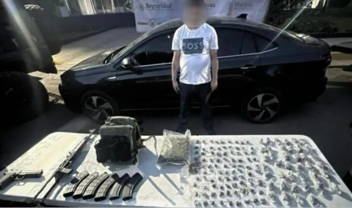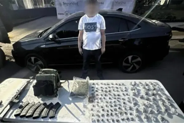 Los elementos del Grupo de Operaciones Especiales (GOES) de la Secretaría de Seguridad Pública Estatal detuvieron a un presunto delincuente que portaba un Cuerno de Chivo y pastillas de fentanilo, en el fraccionamiento Toscana Plus, al norte de Culiacán.
