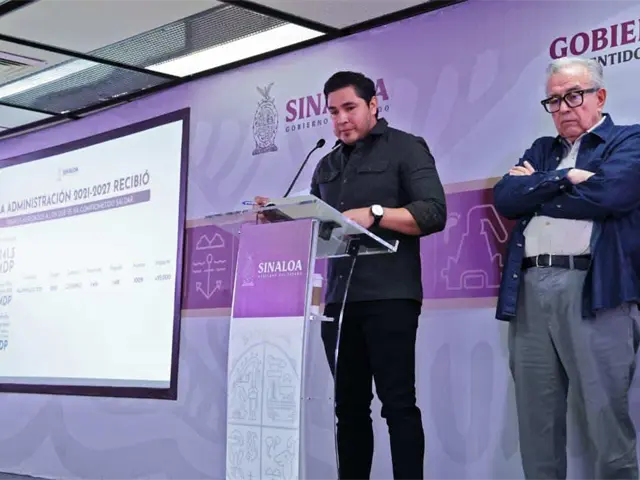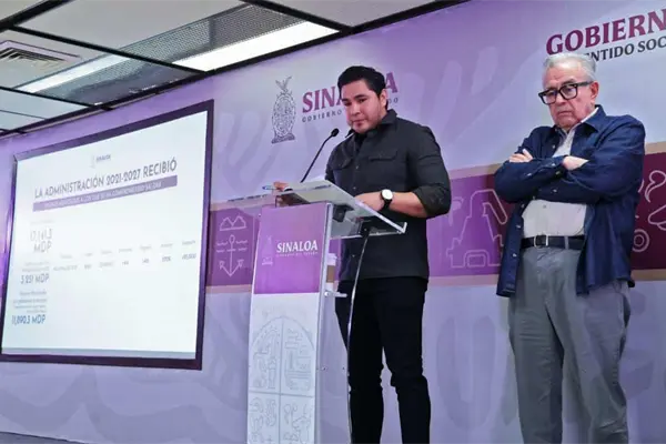 Durante la Conferencia Semanera del gobernador Rubén Rocha Moya, el secretario de Administración y Finanzas, Joaquín Landeros Guicho, informó que la presente administración estatal recibió una deuda heredada principalmente de los gobiernos de Mario López Valdez y de Quirino Ordaz Coppel, por un monto de 17 mil 141 millones de pesos, que se compone por 11 mil 890 millones de retenciones no enteradas, que no tienen fuente de pago, más los 5 mil 251 millones de pesos de deuda a largo plazo.