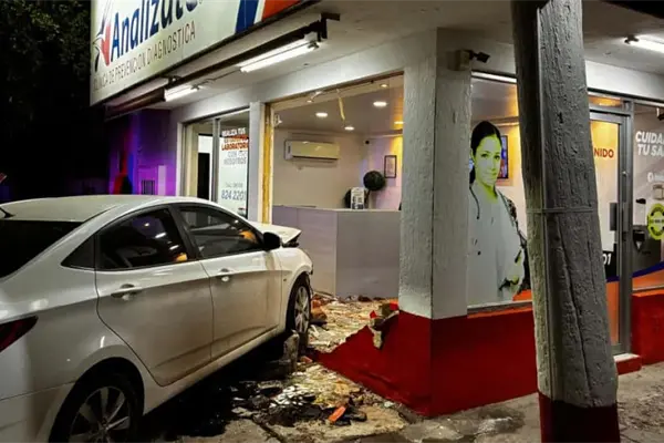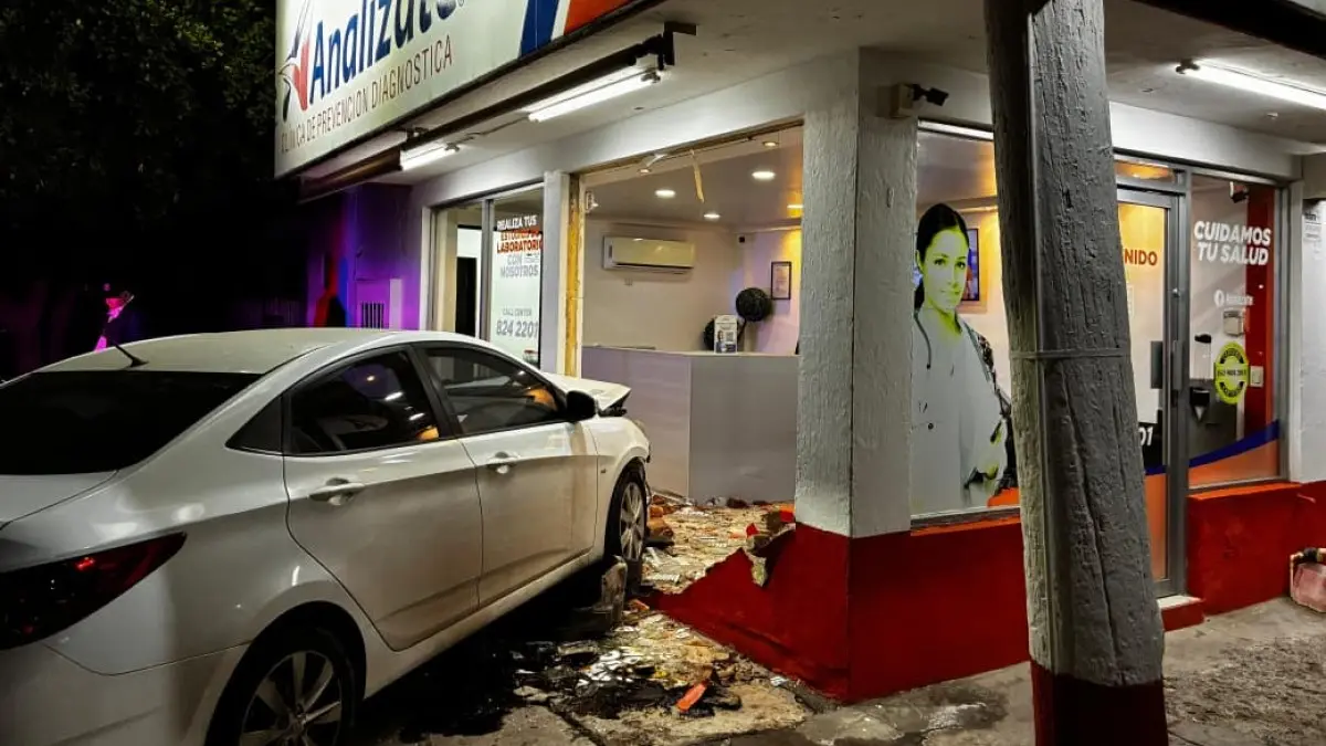 Conductora pierde el control y se estrella contra fachada de un laboratorio en Los Mochis