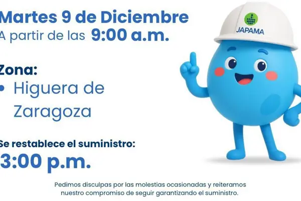 La Junta de Agua Potable y Alcantarillado del Municipio de Ahome (JAPAMA) anunció la suspensión temporal del servicio de agua potable en la comunidad de Higuera de Zaragoza este martes 9 de diciembre, debido a trabajos de conexión en la red como parte de una obra de pavimentación.