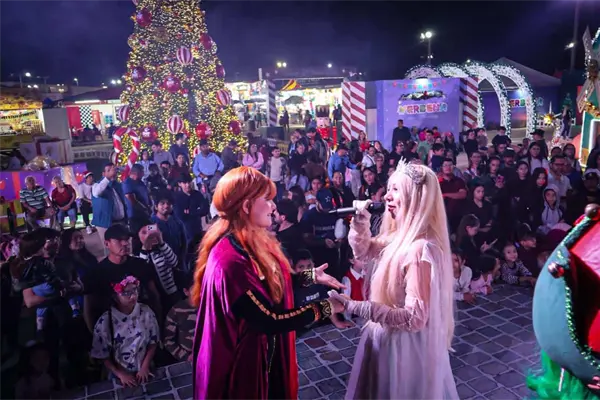 El escenario principal se iluminó con la magia de la Navidad a partir de las 6:00 pm, cuando el show musical Frozen Navideño atrajo a familias enteras que cantaron y bailaron al ritmo de "Libre soy" junto a personajes como Elsa, Anna, Olaf, Santa Claus y los divertidos duendes de caramelo.