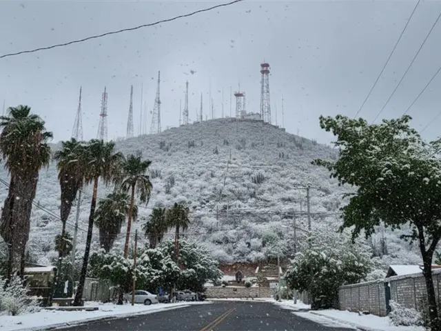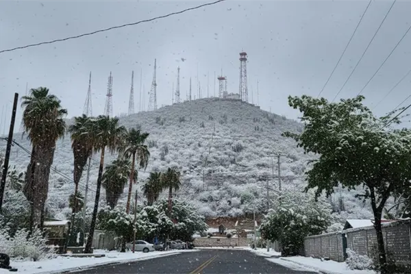 Entre ellos destaca el Cerro de la Memoria, donde la vegetación típica del lugar aparece cubierta de blanco, ofreciendo una postal completamente distinta a la habitual vista semidesértica.