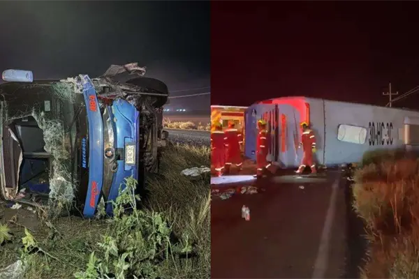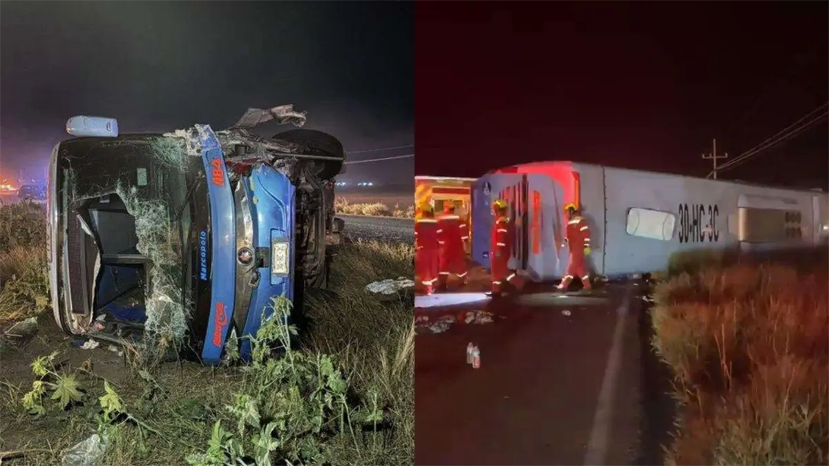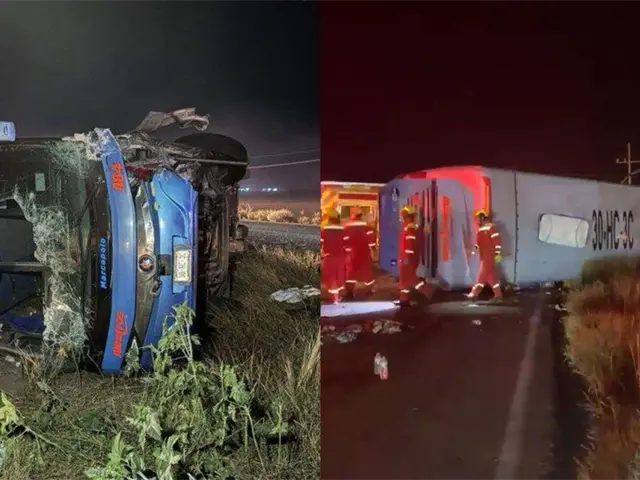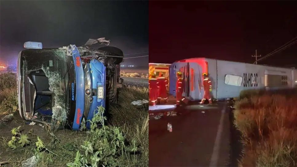 - La información establece que la camioneta habría invadido el carril contrario, impactando de frente al autobús, lo que provocó que el conductor de la unidad de transporte perdiera el control y terminara volcado sobre la cinta asfáltica.