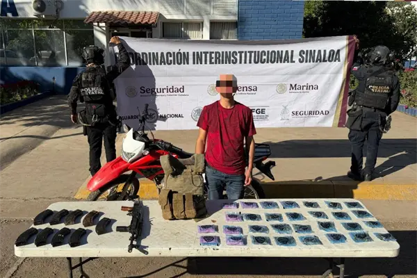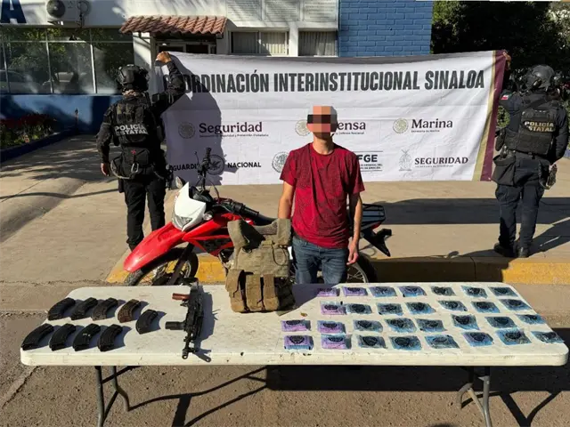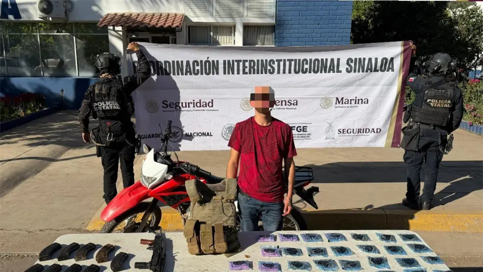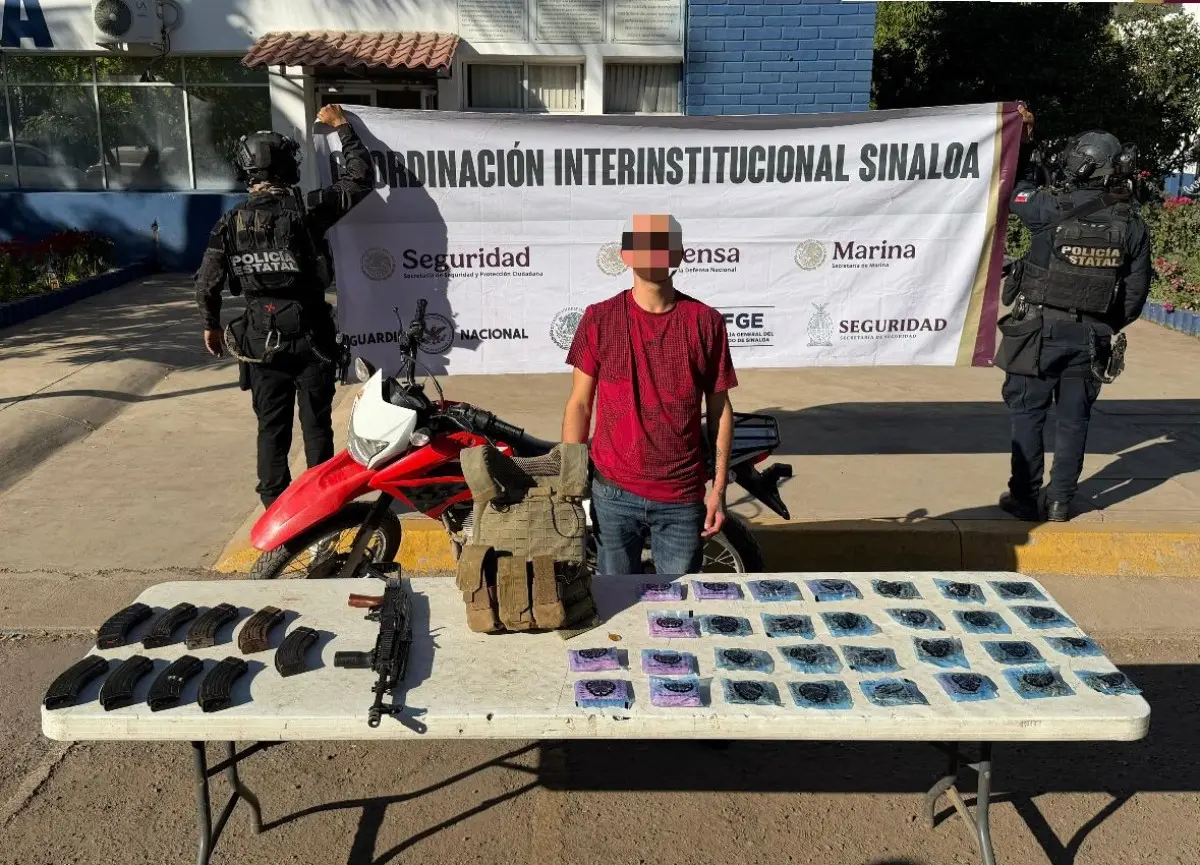 Los elementos de la Secretaría de Seguridad Pública de Sinaloa, a través de la Policía Estatal Preventiva, en coordinación con el Ejército Mexicano, la Guardia Nacional, la Secretaría de Marina, la Secretaría de Seguridad y Protección Ciudadana, la Fiscalía General de la República y la Fiscalía General del Estado, detuvieron a un hombre con armamento, droga y una moto robada en el municipio de Navolato.