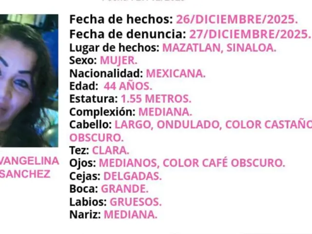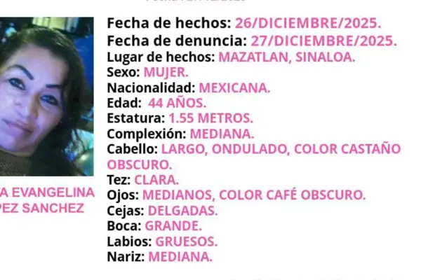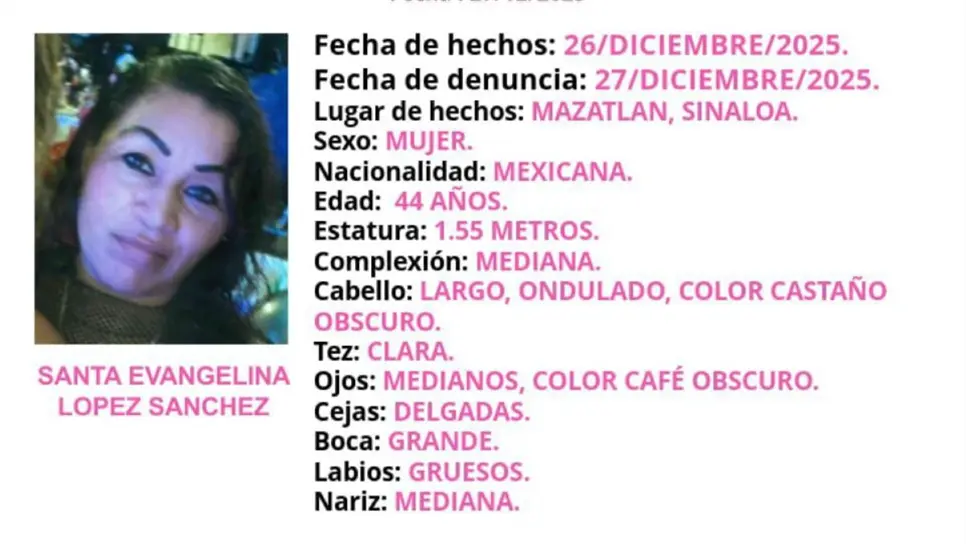 Santa Evangelina López Sánchez de 44 años, desapareció en horas del viernes 26 de diciembre y fue este sábado, cuando familiares reportaron su ausencia ante la Fiscalía General del Estado de Sinaloa, donde se activó el Protocolo Alba para su búsqueda.