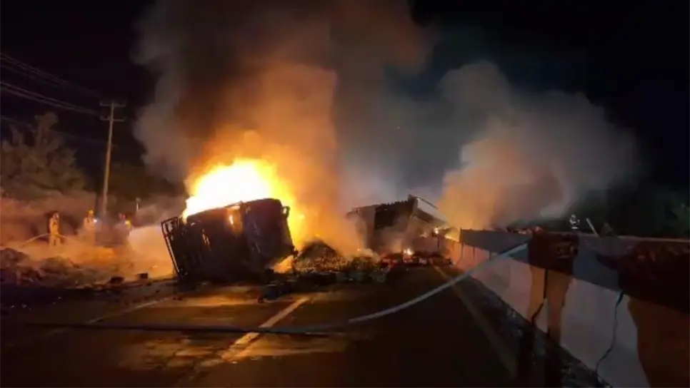 La información establece que un tractocamión de la marca International, que transportaba cientos de cajas con botellas de cerveza "cuartito", vacías, y que se dirigía a Navojoa Sonora, al llegar a la curva chocó con el muro de contención, lo que provocó que terminara volcado e incendiado.