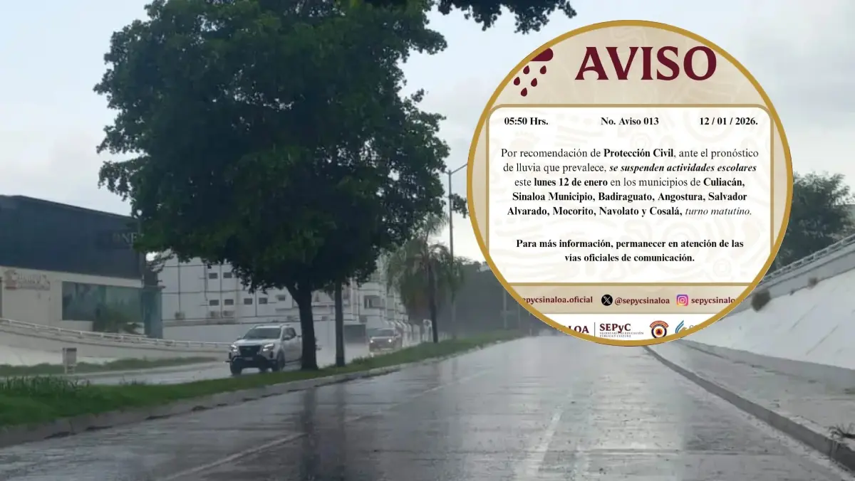 Por fuertes lluvias, La Secretaria de Educación Pública y Cultura (SEPyC) suspendió clases del turno matutino en Culiacán, Sinaloa Municipio, Badiraguato, Angostura, Salvador Alvarado, Mocorito, Navolato y Cosalá.