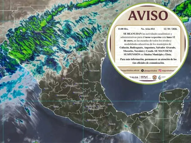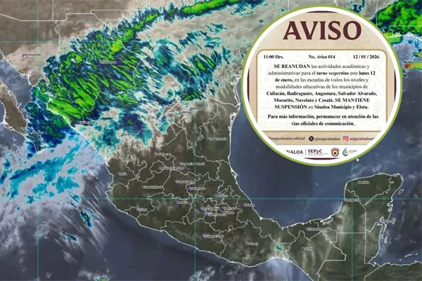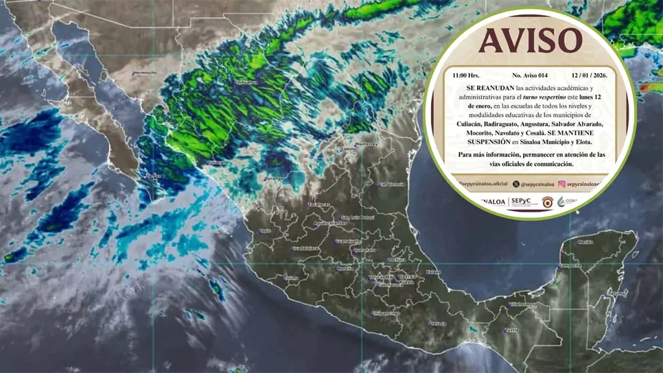La Secretaria de Educación Pública y Cultura (SEPyC) informó que debido a las lluvias, se mantendrá la suspensión de clases en Elota y Sinaloa municipio durante el turno vespertino de este lunes 12 de enero.